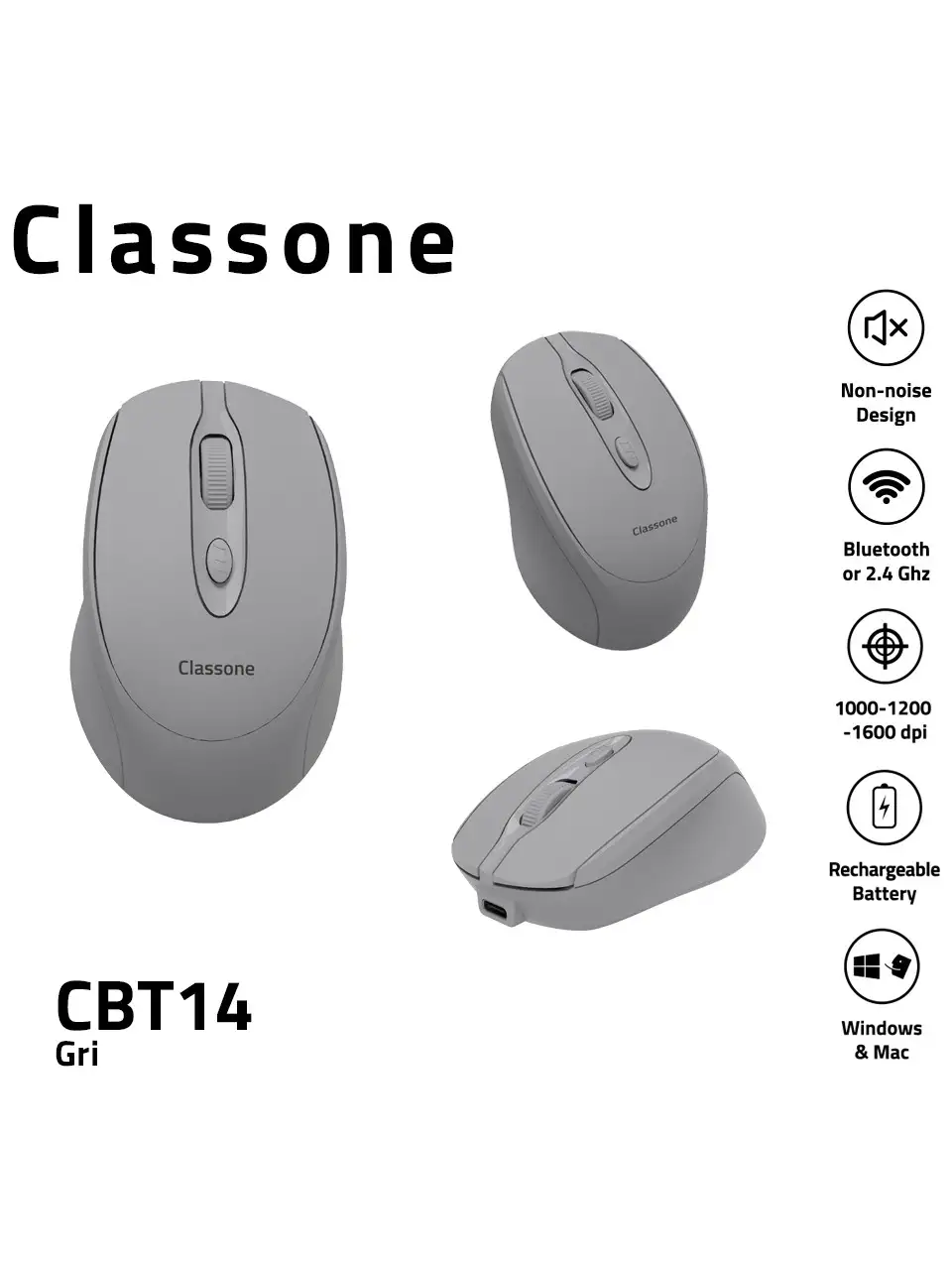 Classone CBT14 Bluetooth + 2.4 Ghz Şarj Edilebilir Kablosuz Mouse - Gri