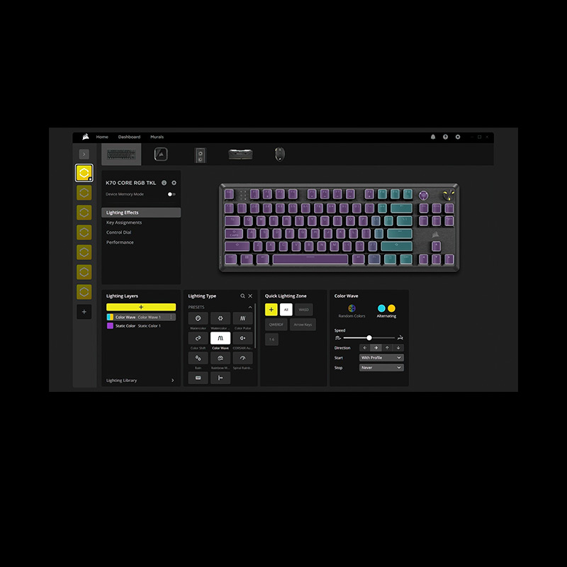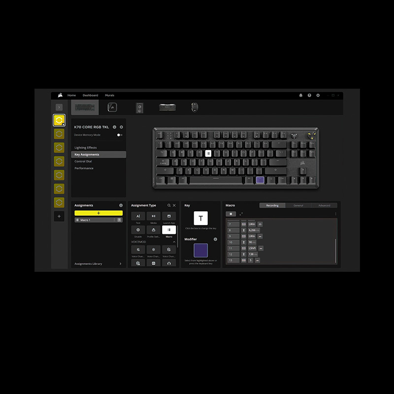 Dünyanın dört bir yanındaki oyuncuların tercih ettiği kompakt, Tenkeyless düzeniyle K70 CORE TKL WIRELESS, kurulumunuza tam olarak uyum sağlar. Önemli fonksiyon tuşlarından ve kısayollardan ödün vermeden masanızdaki alanı en iyi şekilde kullanın.
